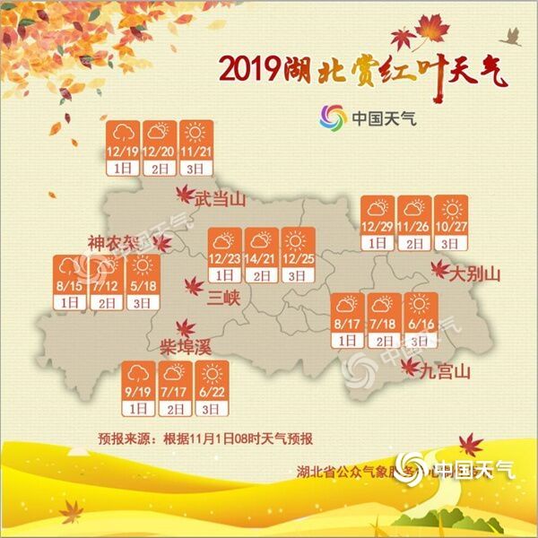 十一月正值湖北的红叶最佳观赏期,本周末湖北大部分地区以多云天气为主,气温适宜,适合来一场说走就走的赏叶之旅。虽然西部地区偶有小雨打扰,在雨中欣赏秋景也别有一番韵味,但要带好雨具。