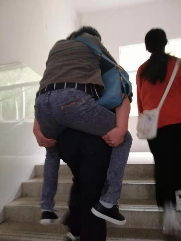 “大概是早上8时30分,我们看到她拄着拐杖,她妈妈在旁边搀扶。我们赶紧过去问了一下具体情况。”武昌理工学院教师刘明杨说,因为她的考室在3楼,就安排了一位老师把她背上去,上午考完试后,又把她背下来。