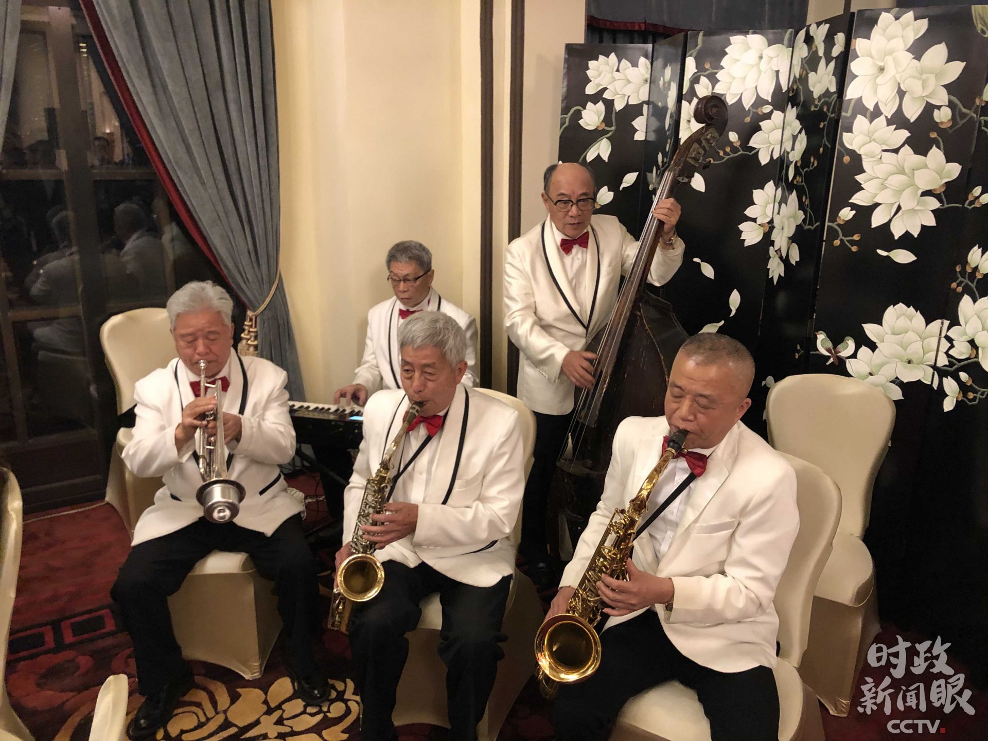 △晚宴现场的五位银发乐手,是和平饭店的第二代爵士乐手,大多从上世纪七十年代末开始在此工作。(央视记者马亚阳拍摄)