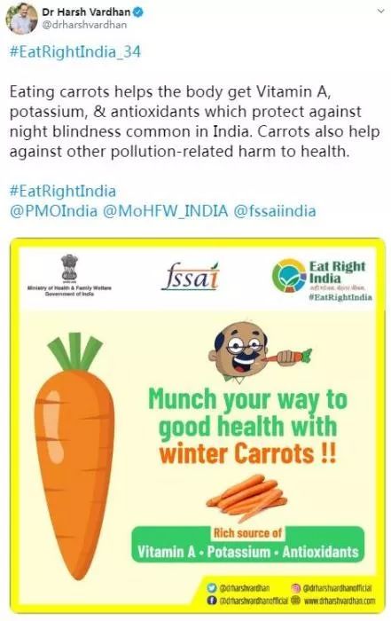 “吃胡萝卜可以帮助身体获得维生素A、钾和抗氧化剂,这些都可以预防印度常见的夜盲症。此外,胡萝卜还有助于抵抗其他与污染有关的健康危害。”瓦丹写道。