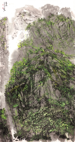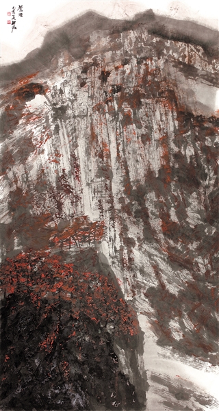 从取向上,紧紧扣住雄浑之美。艺术家的作品就是艺术家心灵的故事。竹君山水画的学术取向,离不开鄂西山区的生活启迪。一九八六年,在大学主攻人物画的丁竹君,被选派到恩施土家族苗族自治州建始县基层锻炼。建始,南邻鹤峰,北连巫山,长江支流清江穿境而过。在他的住地,是一个“出门就爬坡,稍不留神,崖石撞破脑壳壳”的地方。两年多的山区生活,纯朴善良的民风,勤劳坚韧的农民,大气磅礴的群山,滋养了他的灵魂,也改变了他的学术选择。他及时调整主攻方向,由画人物转向画山水,立志以山水画作寄情,给高山厚土立传,为父老乡亲讴歌。巨幅作品《雪凌山岗》,就是再现他在寒冷的冬夜,与村民围坐在吊脚楼的“火笼屋”里,烤着木炭火,啃着腊猪蹄,喝着苞谷酒,醉眼矇眬地推开窗户,远眺群山的瞬间印象:高大的雪山,逶迤的山脊,玄妙的岩石,天上冻云弥漫,地上冰纹缕缕,路边峭壁险峻。难忘建始朴实的农民给了他无比的温暖。由于他深入生活,融入土家人中,豪爽地饮酒,不少人亲切地称呼他为“丁三醉”。巨幅作品《横视苍岩》《山净如染》《静听秋声》《岁月无尽》,就是画家饱含真情,对建始这块风水宝地的春夏秋冬的书写,他渴望这块千岩竞秀、万壑争流的少数民族居住地,在感动自己的同时,也感动他人。竹君说,那时去建始没条像样的公路,从武汉到建始得赶两天的路,白天晚上都在山沟里钻。在恩施七百多个日日夜夜里,满脑子都是高山、悬崖、深谷、流云和像大山一样真诚厚重而谦逊寡言的农民。如果说我的山水画有一点心得,要感谢大山的滋养,要感谢村民的关爱,要感谢生活的召唤!