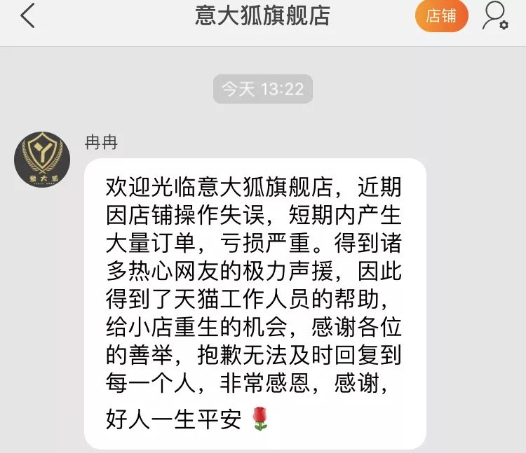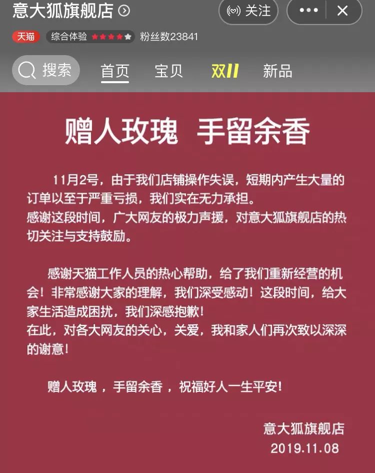 在店铺首页的公告中,该店称:“11月2日,由于我们店铺操作失误,短期内产生大量的订单以至于严重亏损,我们实在无力承担,感谢这段时间广大网友的极力声援,感谢天猫工作人员的热心帮助,给了我们重新经营的机会,我们深受感动。赠人玫瑰,手留余香,祝福好人一生平安!”