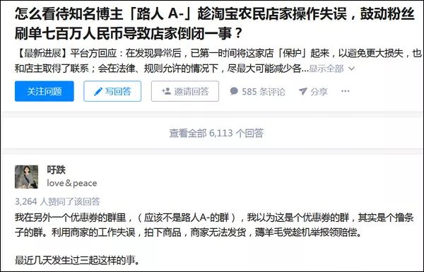 据此前报道,淘宝店家“果小云”因操作失误,误将26元4500克的脐橙写成了4500斤后,B站博主“路人A-”在直播时号召粉丝去“薅羊毛”,随后,上万粉丝涌入“果小云”的店铺下单,涉及金额700万。他们又在商家无法发货的情况下,恶意投诉“商家虚假宣传”,导致该店铺直接关店。