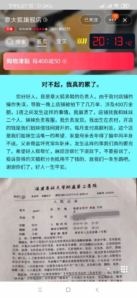 据网友提供的截图,“意大狐旗舰店”曾迫于压力,发表声明让网友取消订单,店主称由于“店铺操作失误,导致一晚上店铺被拍下了几万单,涉及400万金额”,并称该店是他们借钱开的,是“生活唯一的希望”,希望顾客可以退款,不要再投诉,放他们“一条生路”。