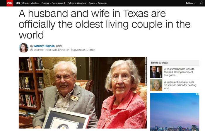 中新网11月11日电 据外媒报道,美国得克萨斯州一对夫妇年龄合计211岁,已获吉尼斯世界纪录确认为“全球最老夫妇”。