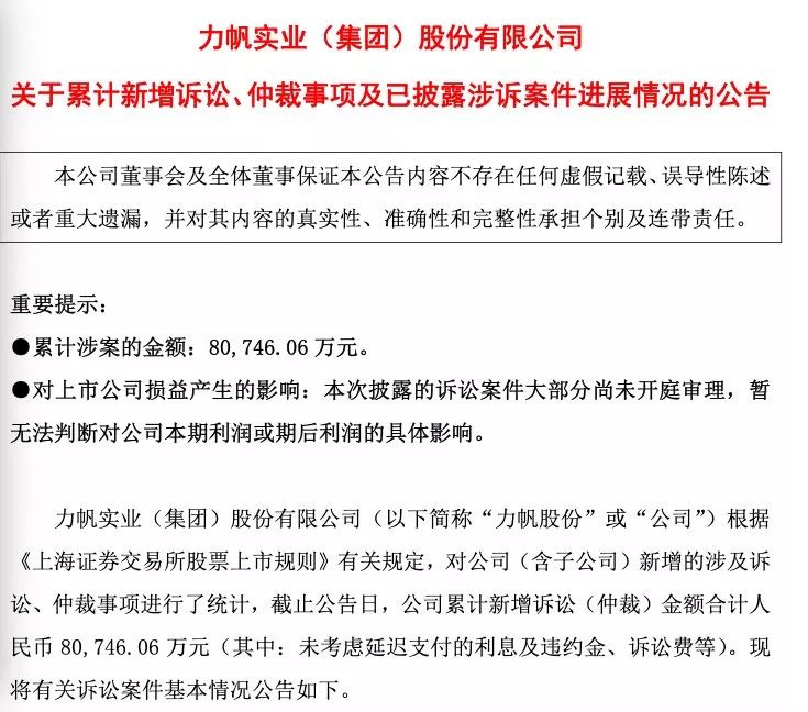 日前,力帆股份发布公告称,在未考虑延迟支付利息、违约金、诉讼费等多重因素的情况下,力帆股份累计新增诉讼金额合计为8.07亿元。在多起财务纠纷中身为被告的同时,力帆股份表示,将积极与相关方沟通处理,争取尽快解决相关诉讼、仲裁事项,鉴于本次公告中涉及的大部分诉讼案件尚未开庭审理,暂且无法判断上述诉讼案件对公司后期利润的具体影响。