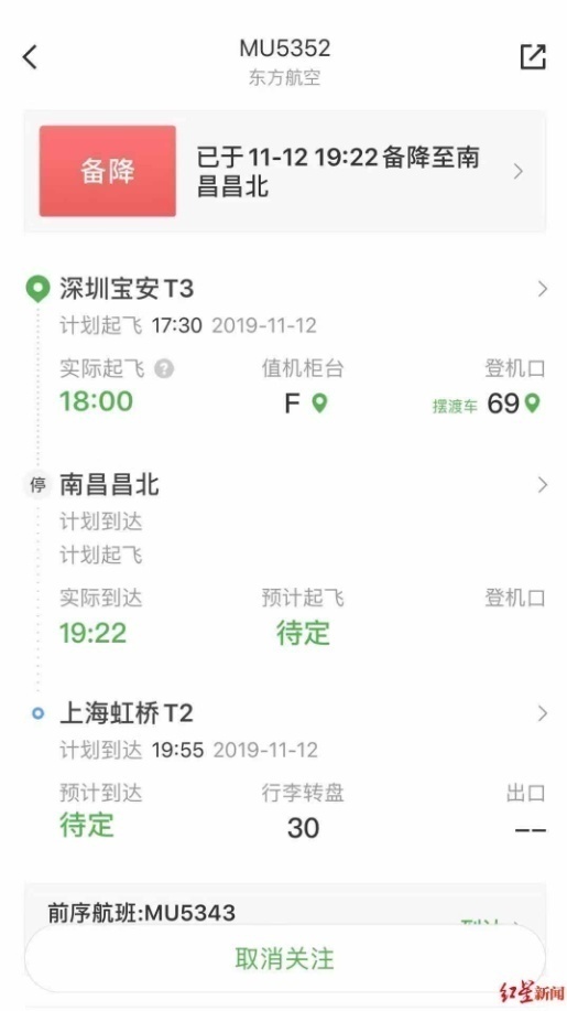 据了解,该航班18时由深圳宝安机场起飞,原计划于19时47分到达上海虹桥机场。据航旅纵横消息,目前该航班已备降至南昌昌北机场。