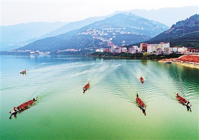 11月6日,参赛龙舟队伍在比赛中奋力争先。当日,秭归县水田坝乡在咤溪河畔举行2019年年度龙舟总决赛。近年来,当地组建五支农民龙舟队实时进行训练,每季度举行一次比赛,年度进行总决赛并给予奖励,旨在引领农村健康文化生活,助力乡村旅游发展,助推乡村振兴。(视界网王罡摄)