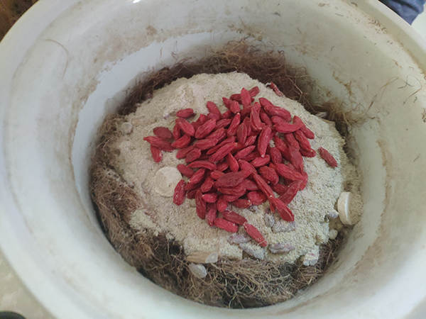 据诊所助理介绍,患者每日将黑色膏体均匀涂抹在腰部两侧,通过类似“火灸”形式,经皮给药肾俞导入,使药物中的活肾因子经穴位直达肾俞,激活肾单位。内服的中药则需要每天早晚各添水1100ml,熬制两个多小时,空腹喝。