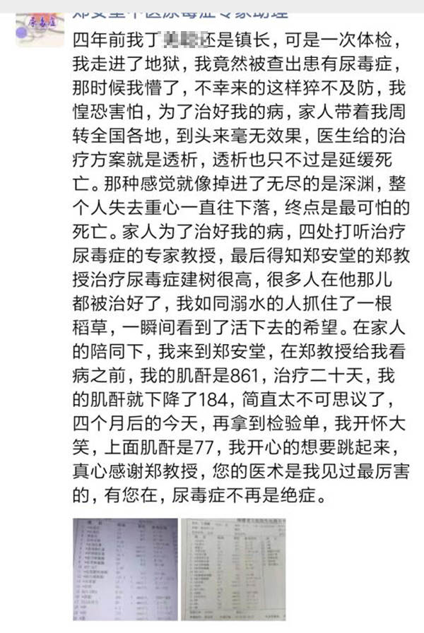 文志感觉被骗了。“包河正康中医诊所”在网上有另外一个名字——“郑安堂”,宣称其“活肾因子,穴位导入”疗法(下称:活肾疗法)可短期治愈尿毒症等疾病。