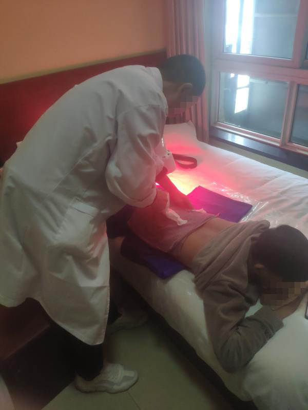 梁建于是背身趴在床上,掀起上衣,露出腰部。该男性医生取出前述黑色膏体,均匀涂抹在梁建腰部两侧,随后将毛巾敷在腰部,倒上水,用烤灯开始加热烘干。