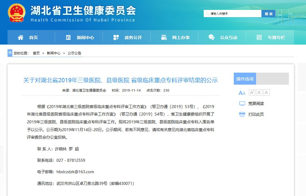 《关于对湖北省2019年三级医院、县级医院省级临床重点专科评审结果的公示》