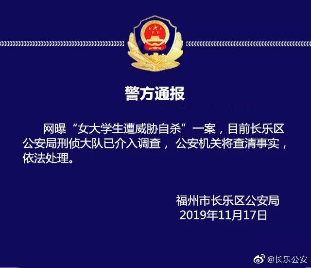 11月17日晚10点39分,福州市长乐区公安局官方微博@长乐公安 发布警方通报,称网曝“女大学生遭威胁自杀”一案,目前长乐区公安局刑侦大队已介入调查,公安机关将查清事实,依法处理。