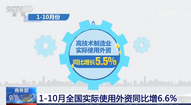 央视网消息:商务部昨天(18日)公布的数据显示,今年前10个月,我国实际使用外资同比增长6.6%,其中,高技术产业实际使用外资实现较快增长。