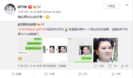 网易娱乐11月20日报道 11月19日,有粉丝在微博晒为郁可唯P古装仙女的照片,并配文称:“脸到P时方知大,我是真的想Ps一个很仙女的古装图,但是后来不知道为什么就跑偏了。 ”照片中,郁可唯的脸被P在了贾玲的脸上,结果粉丝还吐槽道:“贾玲好看”,另一位粉丝则自责的写道:“我对不起唯唯,我明明是想弄唯美古装的,为什么会是这样?”