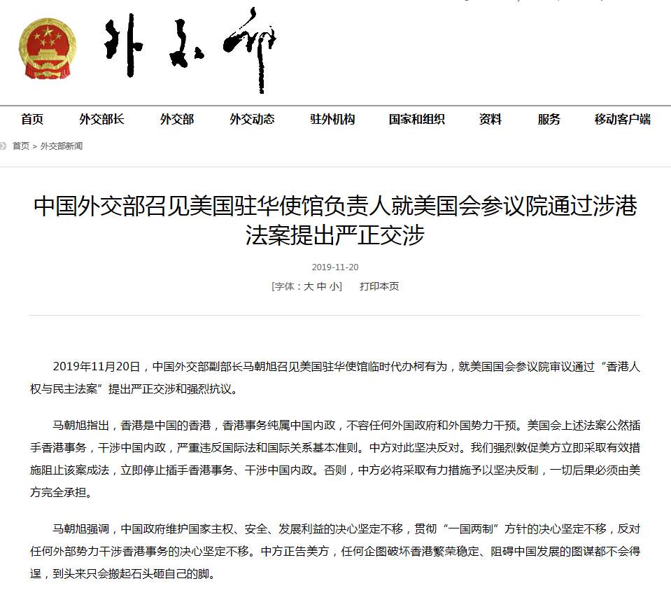 2019年11月20日,中国外交部副部长马朝旭召见美国驻华使馆临时代办柯有为,就美国国会参议院审议通过“香港人权与民主法案”提出严正交涉和强烈抗议。