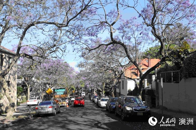 位于悉尼北部的Kirribilli郊区道路两旁盛开的蓝花楹(摄影 刘莹)