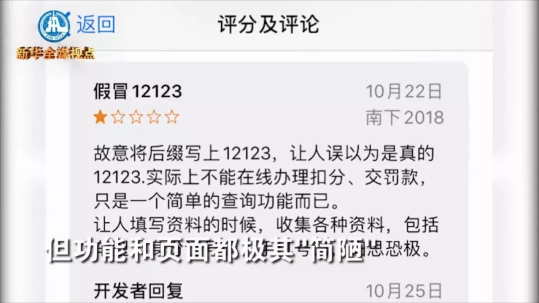 济南市民成栋前不久为网上处理汽车交通罚单,试图在手机应用商店下载公安部推出的“交管12123”APP。搜索结果第一位的为一款名为“12123”的软件,且APP图标为一个“违”字。下载使用后才发现,这款APP功能和页面都极其简陋,是一款高仿APP,不仅无法处理违章,还含有大量广告。