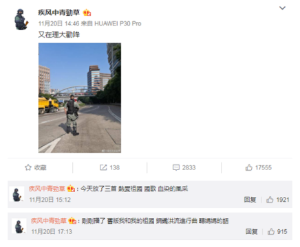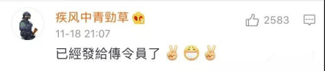当时一位账号名称为“疾风中青勁草”的香港警员在微博俏皮回应:“已经发给传令员了。”↓