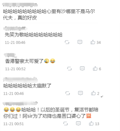 对于香港警方昨晚这波操作,大陆网友的评价是:“真的好皮”、“先笑为敬”“太可爱了”、阿sir为了劝降也是苦口婆心了。↓