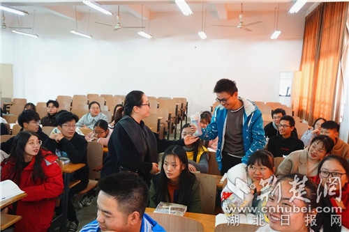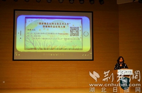 省群艺馆数字资源部业务干部严峰给学生们带来线上、线下两场公益活动介绍。目前由湖北省群众艺术馆正在举行的《湖北民间文化艺术之乡&我身边的非遗》微视频线上征集活动,将一直持续到2020年的7月份,此次活动届时会有评奖活动和现金奖励。《湖北高校第八届美术与设计大展》是由省群艺馆开展的线下作品活动,截止至今年的11月29日。两场线上、线下的公益活动旨在为湖北民间传统文化艺术的传承和发扬添砖加瓦,让湖北民间传统文化艺术更好地和现代技术碰撞、融合传承和发扬下去。