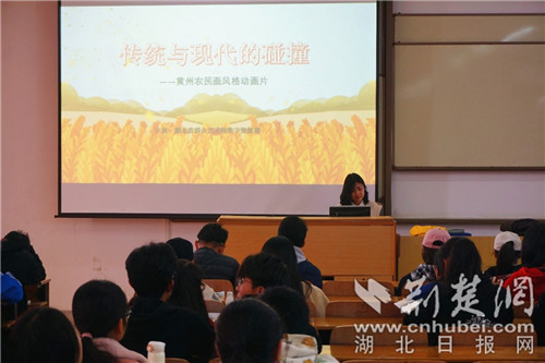 荆楚网客户端—荆楚网消息(记者 叶辉 通讯员 田耘 实习生 尹贤哲)11月19日-11月20日,湖北省群众艺术馆《传统与现代的碰撞:黄州农民画风格动画片》项目推介活动走进武汉传媒学院、武汉体育科技学院,当“妈妈我要吃虫虫”的配音随着画面呈现出来的时候,同学们在欢笑的同时,也对动起来的农民画惊叹不已。
