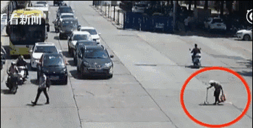 广西贺州的街头,一名奶奶拄着拐杖想要过马路,颤颤巍巍的在车流中前行。