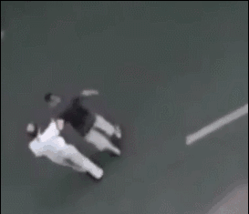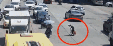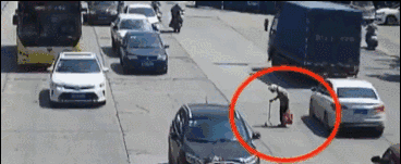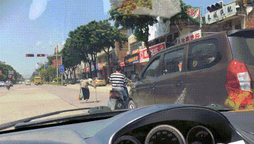就在这时,一名骑着摩托的男士直接横插在车流中,逼停了后方的车辆,并示意车主让老人安全走过。