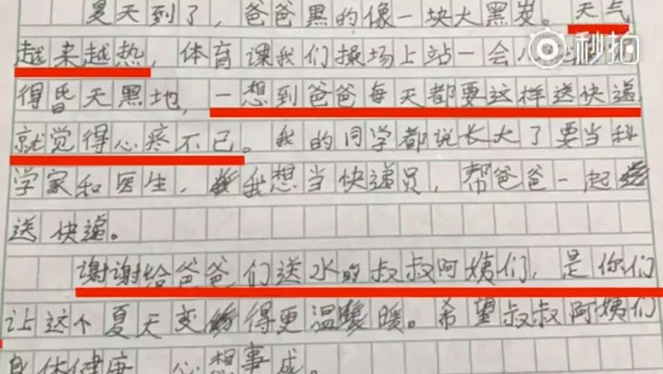 工作人员走上前查看,原来男孩放了一封信进去,男孩的父亲是一名快递员。信中写着:“谢谢给爸爸们送水的叔叔阿姨们,是你们让这个夏天变得更温暖。”