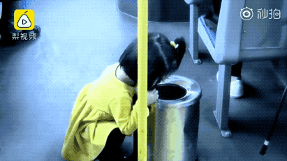 公交车上,一名看上去仅有三岁左右的小女孩,为了不弄脏车内的地板,蹲在垃圾桶旁边,小心翼翼地吃着手里的雪糕。