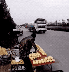 一个水果摊摊主忙于整理水果,并没有发现洒水车即将驶来。洒水车司机通过他身边时,关上阀门,通过之后又重新打开。