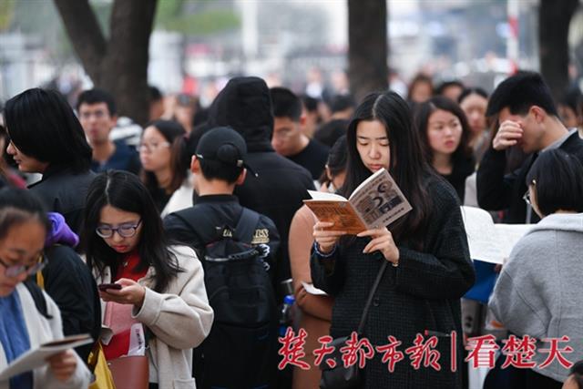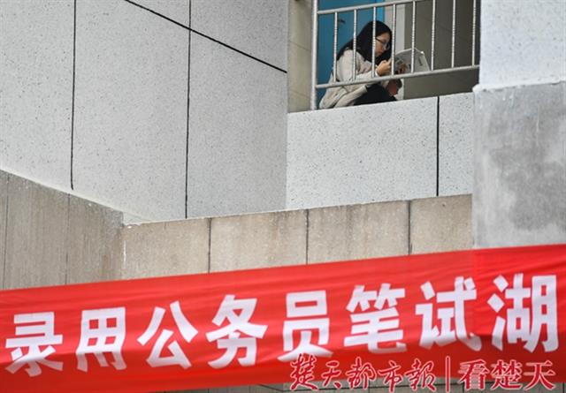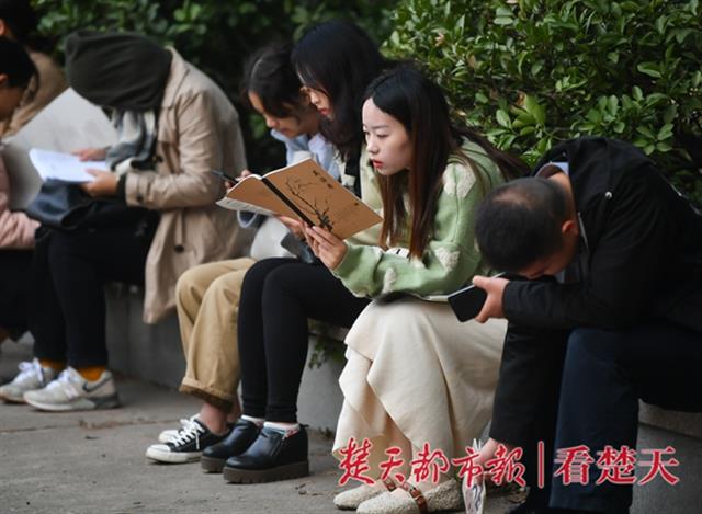 11月24日,国家公务员考试武汉一考点外,考生们抓紧开考前最后的一点时间紧张的复习备考资料。公考热一直存在甚至持续升温,报名人数,除在数年前有过短暂的下落,后来基本呈现递进增长。近几年,无论是国考还是省考,一个职位有成百上千人竞争的现象屡见不鲜。(楚天都市报记者 萧颢)