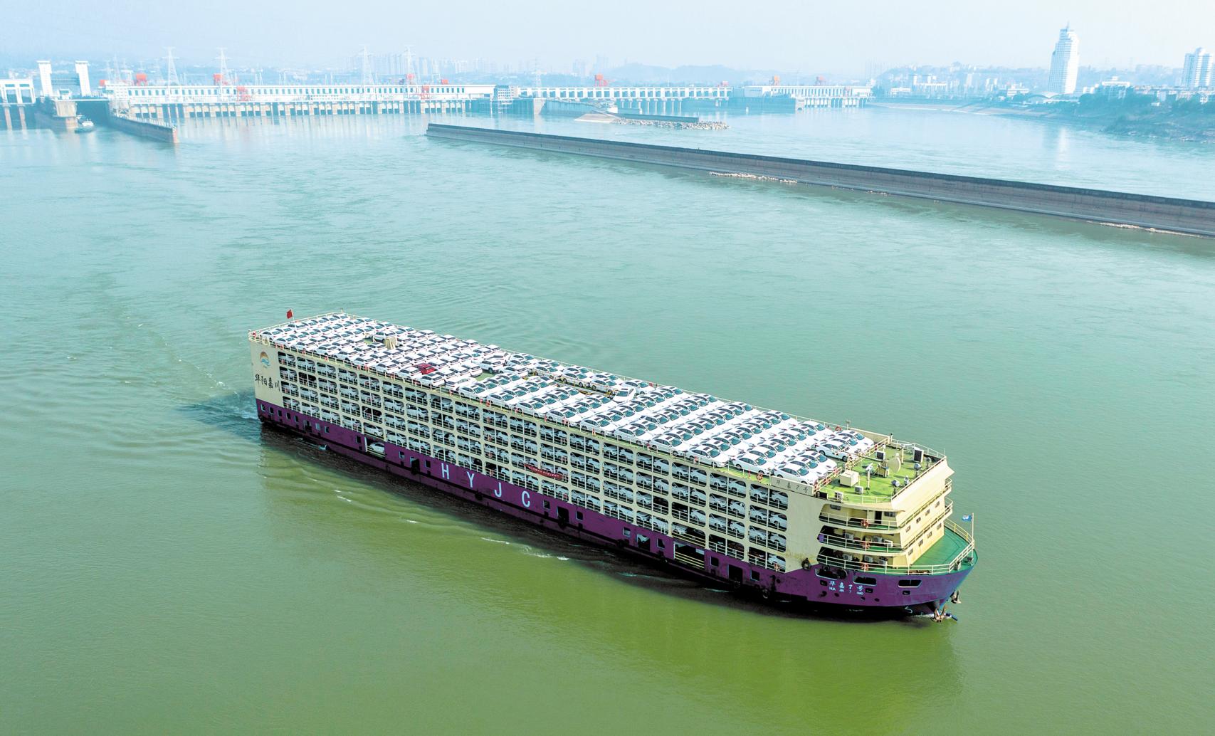 11月22日,满载汽车的大型运输轮船通过葛洲坝船闸,畅行在三峡宜昌段航道。三峡集团流域枢纽管理局持续优化三峡工程枢纽航运环境,保障三峡枢纽水域安全,为三峡段长江“黄金水道”的畅行保驾护航。截至9月,三峡船闸已安全高效运行16年,三峡升船机安全平稳运行3年,三峡枢纽2019年累计货运通过量突破1亿吨,比往年提前了约半个月。(湖北日报全媒记者 刘曙松 摄)