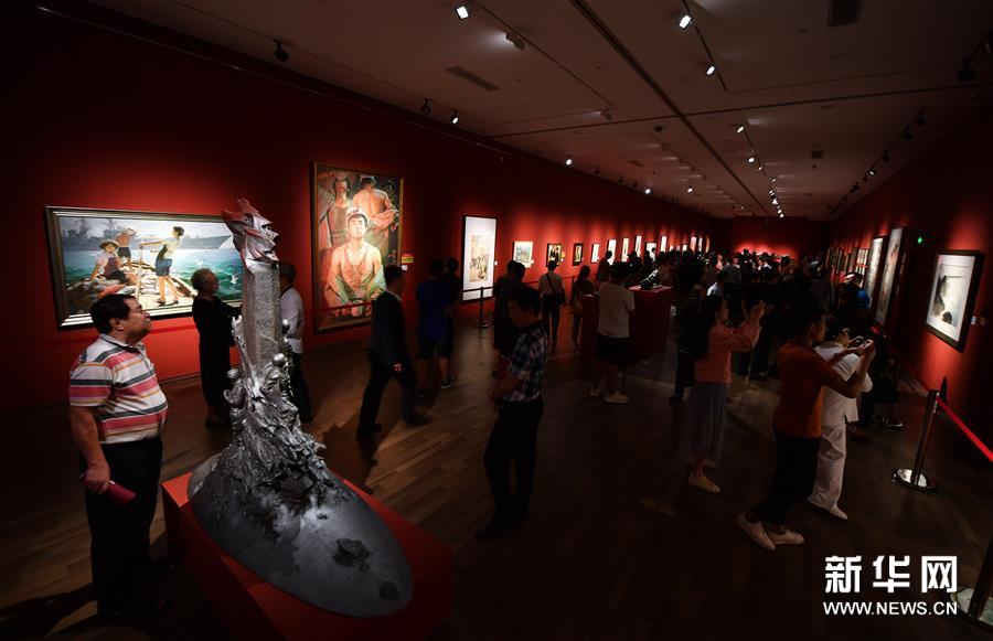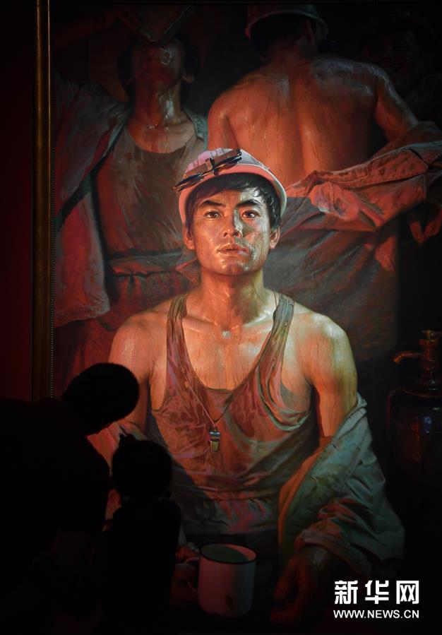 11月23日,观众在观看广廷渤油画作品《钢水·汗水》。当日,“天容海色”中国美术馆馆藏精品展在海南省博物馆开展。本次展览共展出中国美术馆馆藏精品53件,涵盖了中国画、油画、版画等类型,吸引市民和游客前来参观。新华社记者郭程摄