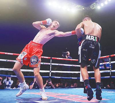11月24日,徐灿(左)和美国拳手曼尼·罗伯斯在比赛中。新华社记者 李 颖摄