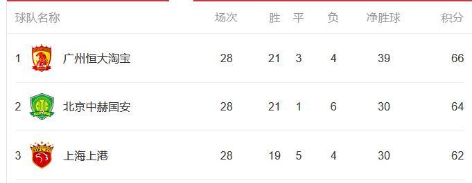 目前在积分榜上,广州恒大以领先北京国安2分的优势排名榜首,上海上港落后北京国安2分排名第3。理论上,这3支球队都有夺冠的希望,但上港夺冠的可能性远低于竞争对手。