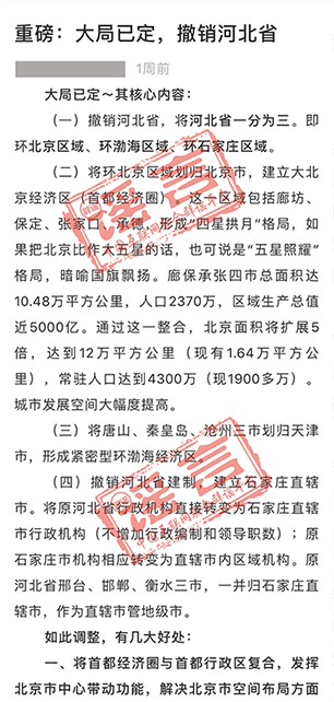 近日,一则“重磅:大局已定,撤销河北省”的消息在网上传播,引起不小的波澜。经查询河北省人民政府官网,并无相关信息。2019年3月、2017年12月,网络两次热传“2020年四川省行政区划调整”的消息,两次谣传内容竟只字未改。2018年11月,内蒙古和辽宁分别传出将调整行政区划的消息,甚至传出所谓“拟撤县设市(区)名单”和“XX省人民政府文件”。近年来,这样的案例确实不少,但最终都被相关部门强力辟谣,证实其为假消息。