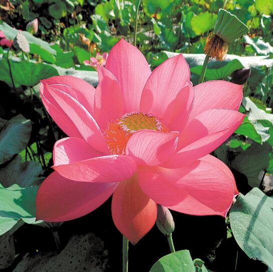 武汉植物园自2015年起开始国际登录认证荷花新品种,至今已有14个荷花新品种获得国际认证,其中大部分品种都属于长花期秋荷品种,引领着国际长花期秋荷育种的方向。秋荷系列品种在长江中下游地区及其以南地区的正常自然条件下,整体花期可从6月持续到10月下旬,突破了只能夏季赏荷的季节限制,让公众在萧瑟的秋天乃至初冬,依然可以看到“青荷盖绿水,芙蓉披红鲜”的美丽景象。秋荷系列新品种的选育和推广已于今年获得湖北省科技进步三等奖,部分新品种已向农业农村部申请植物新品种权保护。