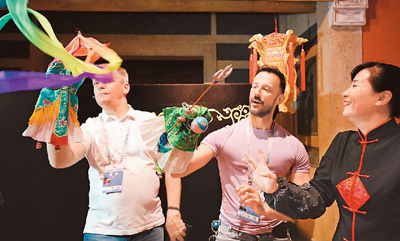 来自马耳他的凯特库蒂(中)与伙伴一同体验泉州南派布袋木偶戏。