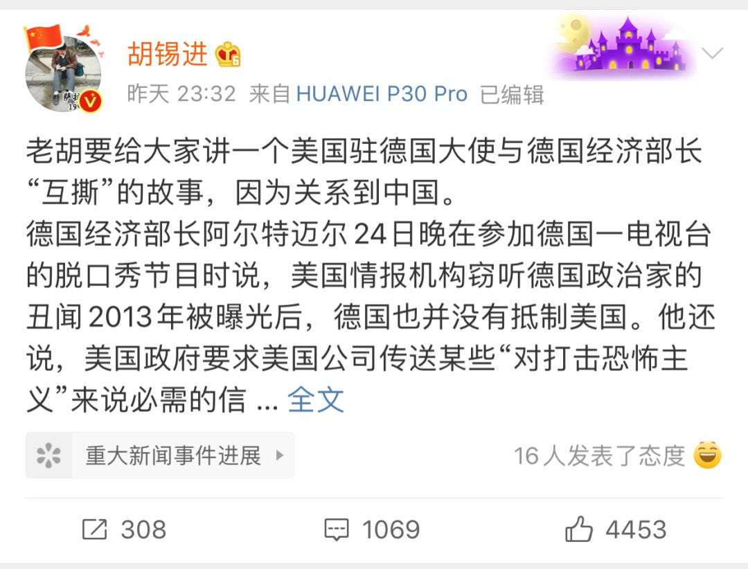 接下来老胡要说说了。首先我认为,这位美国驻德国大使侮辱了14亿中国人民。他公然宣称今天的美国和今天的中国在道德上不对等,将美国置于道德的优越位置上,这是不能接受和原谅的。