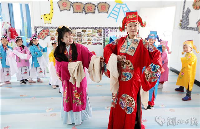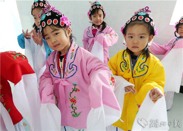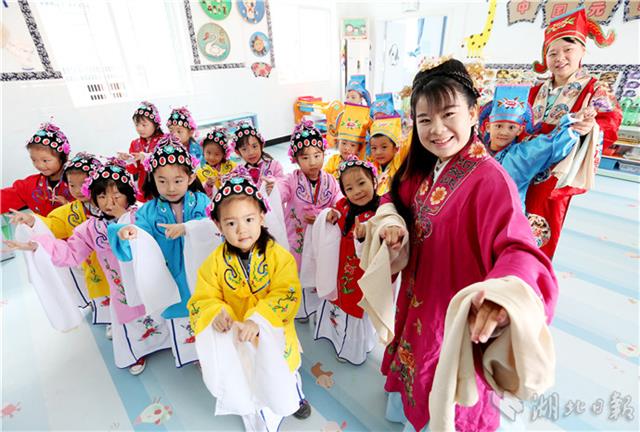 2019年11月10日,麻城市幼儿园老师曾荣(前一)在与孩子们一起练习《东路花鼓戏》。麻城市经典戏剧进校园,营造浓郁的校园文化氛围,全市436所中小学校开设《东路花鼓戏》、《黄梅戏》文化课程。通过经典戏剧进校园活动,引导学生弘扬传承中华传统优秀文化。据悉,麻城市《东路花鼓戏》距今有近300年历史,是鄂东百姓最喜爱听爱看的地方戏剧。(湖北日报全媒记者 张鸿 通讯员 万永庄 周新侠 摄)