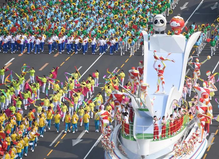 2019年10月1日,在新中国成立70周年庆祝活动上,群众游行中的体育强国方阵。