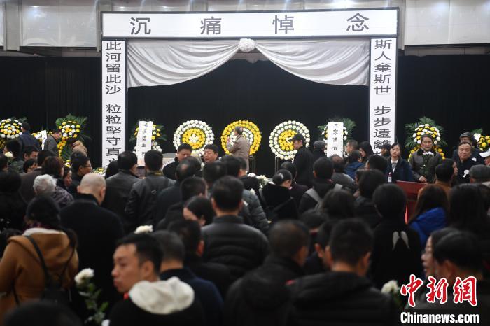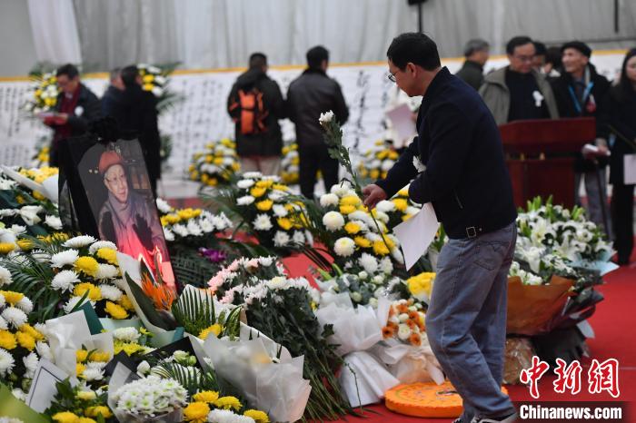 中新网成都11月27日电 (岳依桐)著名诗人、作家、学者流沙河的遗体告别仪式27日在成都市东郊殡仪馆举行。流沙河的遗体被安放在“斯人弃斯世,步步远离朽木草;此河留此沙,粒粒坚守真文明”的挽联前方。百余位社会各界人士从中国各地赶来,佩戴白色纸花、手持白菊,与流沙河正式告别。