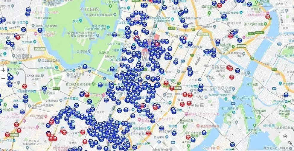 东京AED设置密度极高,尤其是车站周边。 图片来源:AED N@VI APP,作者截取