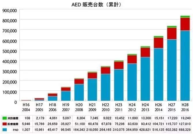 从2004年开始,日本的AED累计贩卖数显著增加 (PAD:公共场所等一般市民也可以接触使用的地方) 图片来源:日本心臓財団