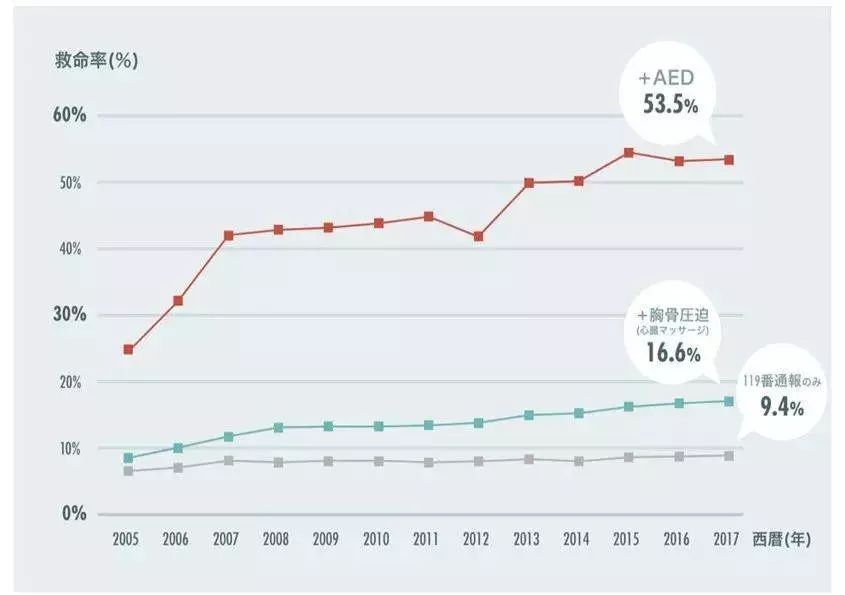 根据日本総務省消防厅2018年的统计数据,使用了AED,患者的救命率能提升到53.5%,比仅仅呼叫急救车高出了6倍,也比只做心脏按压高出了3倍。