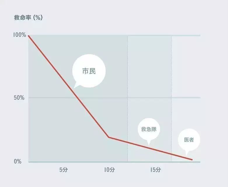 图为发生心脏骤停后的获救率变化。越早给予处理,生存率会越高,所以普通市民具有一定急救知识是十分必要的。 图片来源:日本AED財団