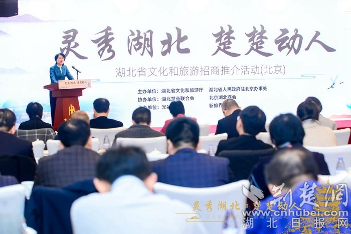 荆楚网客户端—荆楚网消息(记者 叶辉 郝菁 通讯员 邢君成)“灵秀湖北,楚楚动人”!11月27日,湖北省文化和旅游厅、湖北省人民政府驻北京办事处在北京湖北大厦举办湖北文化和旅游北京招商推介会。来自中国青旅集团、北斗航天卫星应用科技集团、国开城市交通投资发展基金、伟光汇通、北辰集团、宏泰发展集团、华熙国际集团、高德地图、融创文旅、阿里巴巴、腾迅、完美世界、中国文化传媒集团等近百家世界500强企业、中国文化企业30强、文旅企业上市公司、楚商企业受邀参加了推介活动。