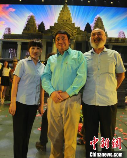 图为姜昆与《吴哥王朝》现场负责人刘薇(左)和《吴哥王朝》导演(右)合影。 黄耀辉 摄
