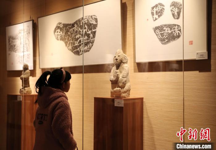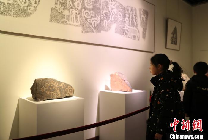 一位小朋友正在宁夏博物馆参观“阿拉善——岩画与居延汉简艺术展”。 于晶 摄